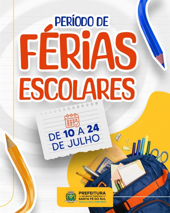 A Secretaria Municipal de Educação da Estância Turística de Santa Fé do Sul divulgou o calendário oficial das férias escolares de julho, que ocorrerão de 10 a 24 de julho, para os alunos da Educação Infantil e do Ensino Fundamental (Ciclos I e II) da rede municipal.